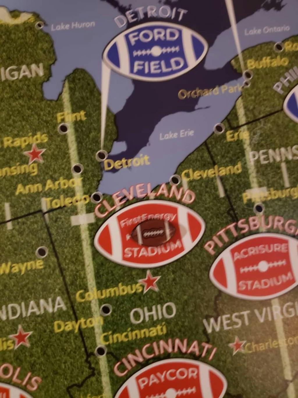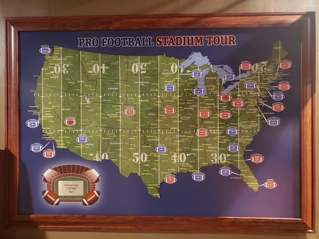 Set a goal to visit every stadium in the league. Upon visiting a new stadium, simply pin the football of the stadium you visited to track your progress and create a unique keepsake of your football adventures. Or use these specialty football-shaped push pins for added pizzaz! Never forget that thrilling game-winning touchdown by your favorite team with this American Football Travel Map. Score a touchdown by gifting this football stadium map with pins to your football-obsessed loved ones! For a more neutral color palette, check out our other Football Stadium Travel Map.