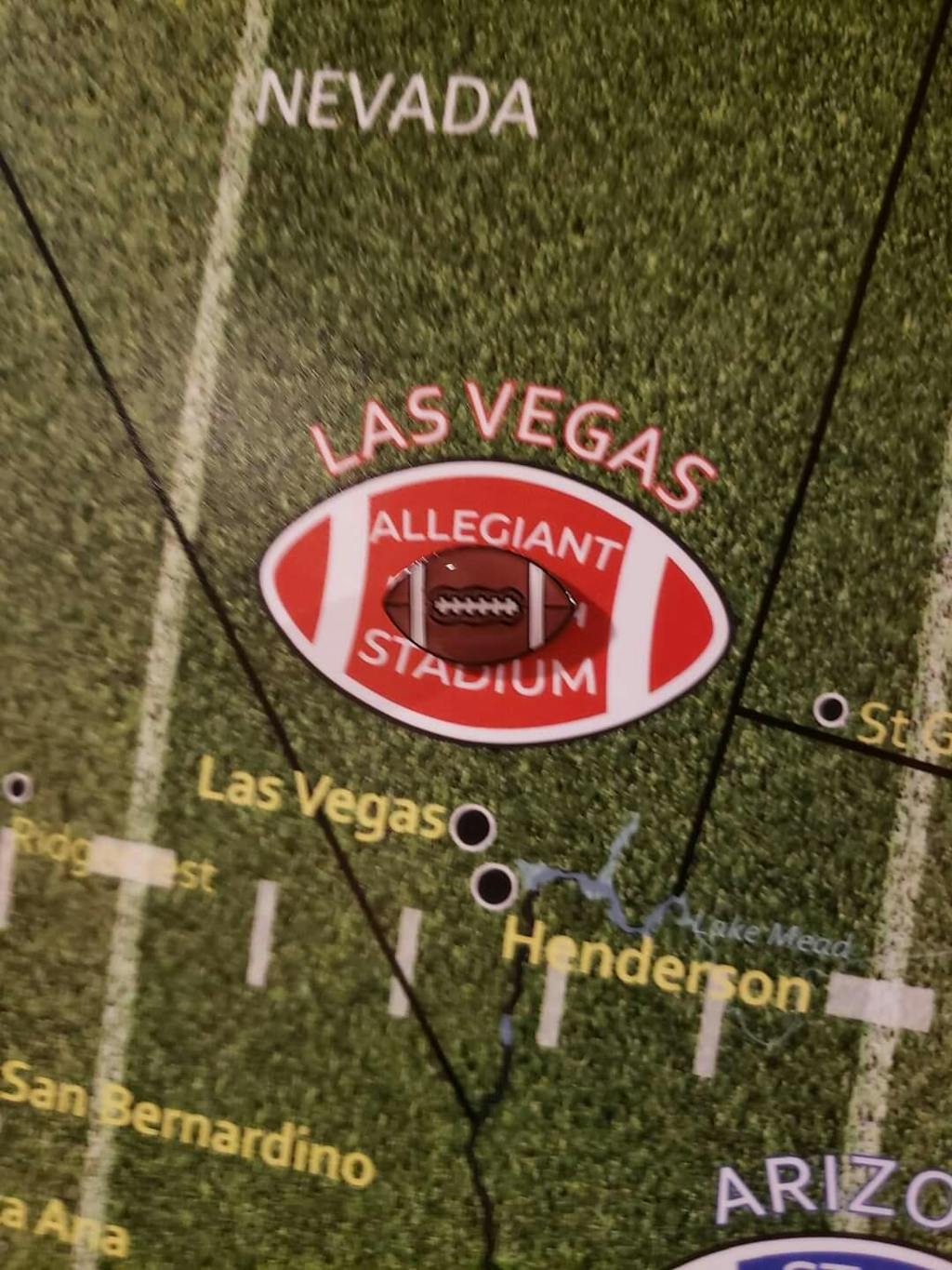 Football fans rejoice! Tracking your treks to catch a game at all 32 pro football stadiums has never been easier with this handy Pro Football Stadium Map with pins. This football stadium tracker map has an attractive dark blue background with a fun green turf covering the US, complete with yard lines, to represent a football field. Each of the 32 national football league stadiums are listed in either a red or blue colored football to represent the National and American conferences. This map is up to date with Allegiant Stadium in Las Vegas.