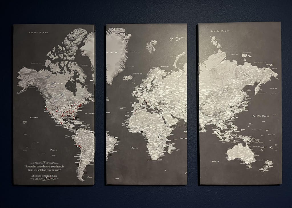 Our Gallery Wrapped/Stretched Canvas Maps are available in three versatile sizes: 24"x36", 30"x45", and 34"x51" inches. Each map is professionally wrapped around a sturdy wooden frame, giving it a sleek, modern look that’s ready to hang. From a classic statement piece to a larger-than-life conversation starter, there’s a size that’s perfect for every wall and every traveler’s story.