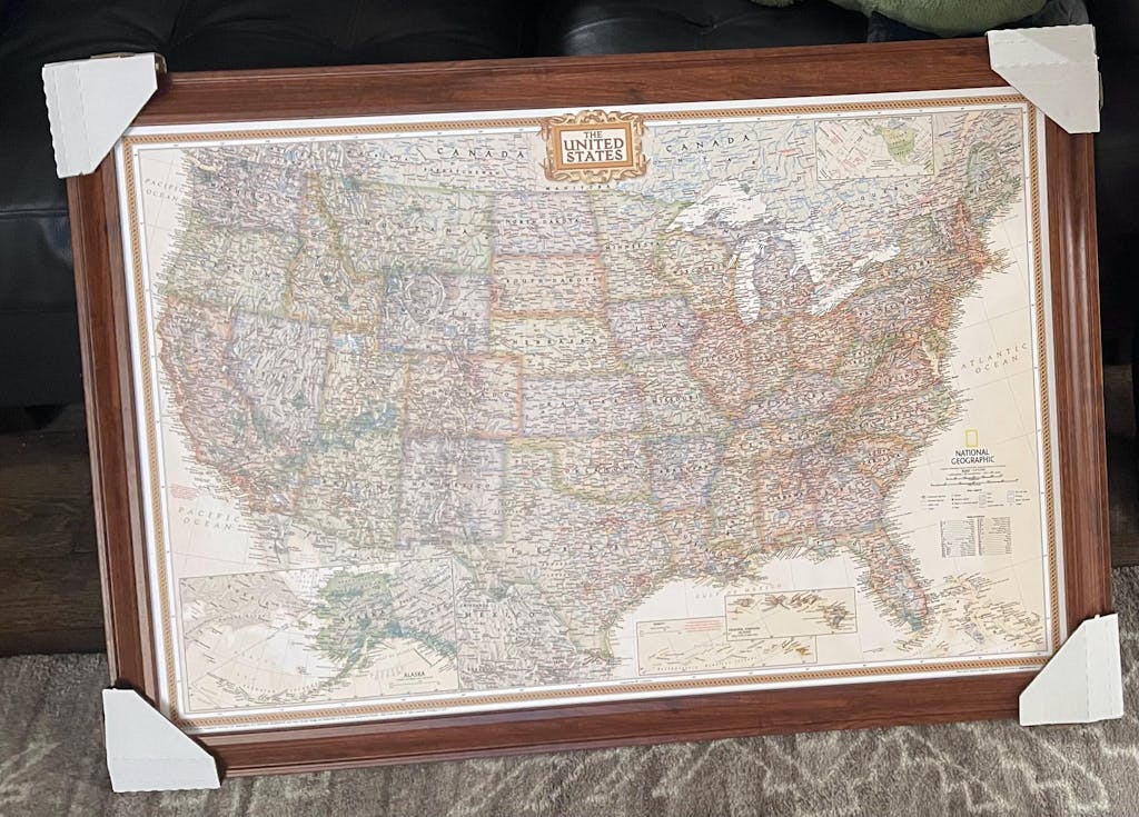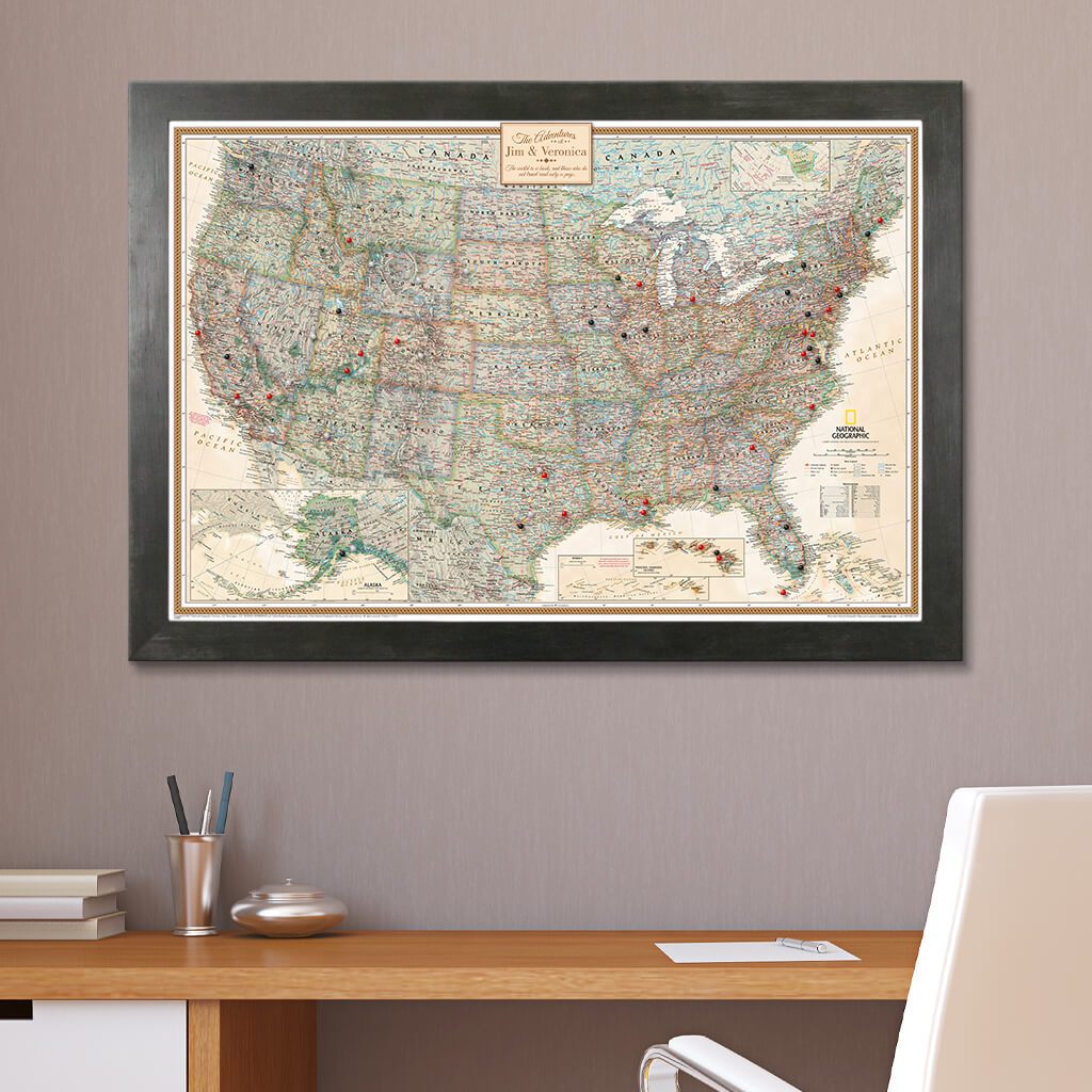 Every Push Pin Travel Map is handcrafted in The United States of America (Denver, CO to be exact!). We take great pride in every map we produce. We start by professionally dry mounting your map to sturdy foamcore board. Our framing experts then place the map in the stylish frame of your choice, which we build in house. Next a wire hanging kit is installed, so your map arrives ready to hang right out of the box. We even include a nail and hanger so you can easily hang your map on the wall. Find out more details as well as answers to popular questions in ourFAQ section here.