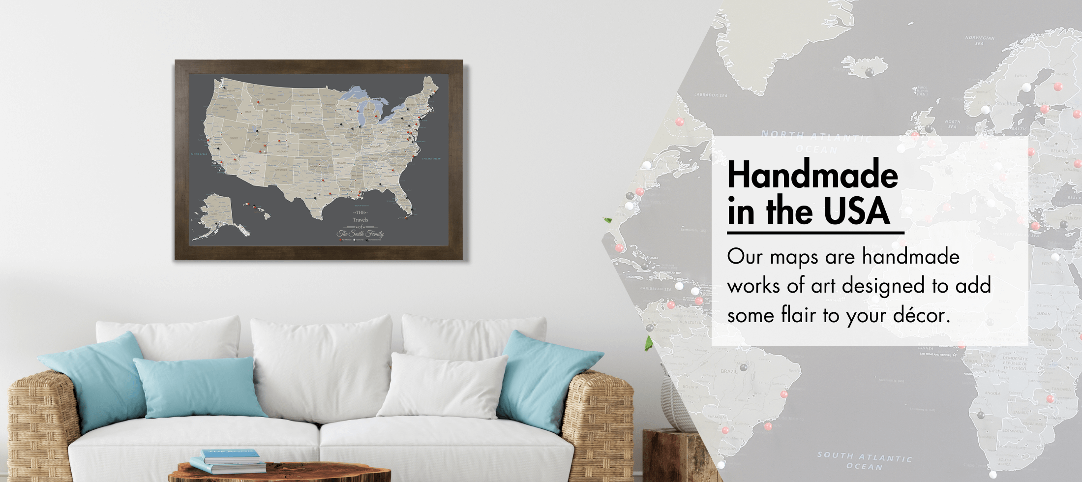 Every Push Pin Travel Map is handcrafted in The United States of America (Denver, CO to be exact!). We take great pride in every map we produce. We start by professionally dry mounting your map to sturdy foamcore board. Our framing experts then place the map in the stylish frame of your choice, which we build in house. Next a wire hanging kit is installed, so your map arrives ready to hang right out of the box. We even include a nail and hanger so you can easily hang your map on the wall. Find out more details as well as answers to popular questions in ourFAQ section here.