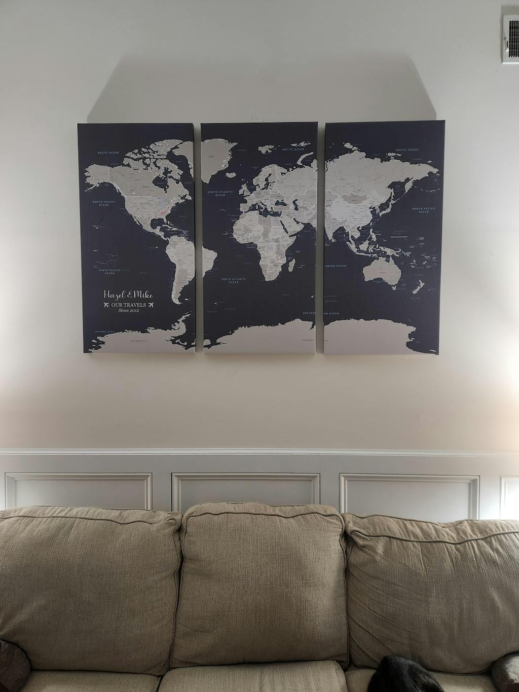 We realize one personalization design does not fit all. That’s why our graphic designer created 9 unique personalization templates for our canvas travel maps so you can truly make the map your own! Select your favorite option from the drop-down menu above and enter your text in the designated box. Your custom personalization will be printed directly on your canvas map.