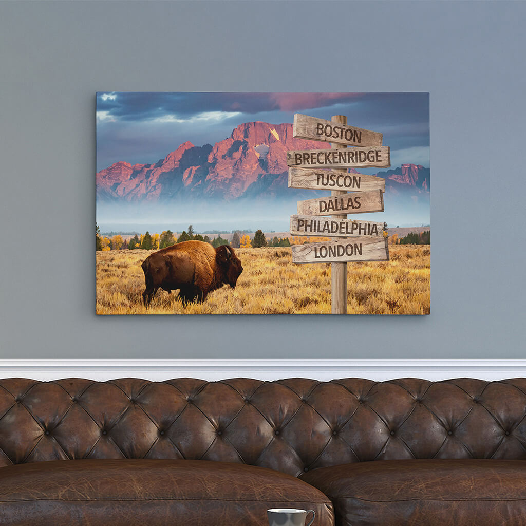Create a personalized canvas keepsake for your family with this American Bison Wall Art featuring the names of your loved ones on a stylish wooden signpost. Include up to 10 signs with your family members’ names or where they live. Your personalized family artwork will be printed on premium canvas to give it a rich texture that is sure to stand out on any wall in your home or office. This design features a regal American Bison in front of majestic Mount Moran outside of Jackson Hole, Wyoming. Makes a truly unique and unexpected gift idea!