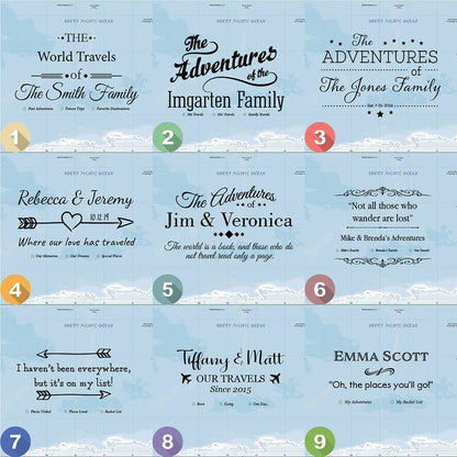 We realize one personalization design does not fit all. That’s why our graphic designer created 9 unique personalization templates for our canvas travel maps so you can truly make the map your own! Select your favorite option from the drop-down menu above and enter your text in the designated box. Your custom personalization will be printed directly on your canvas map.