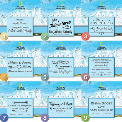 We realize one personalization design does not fit all. That’s why our graphic designer created 9 unique personalization templates for our canvas travel maps so you can truly make the map your own! Select your favorite option from the drop-down menu above and enter your text in the designated box. Your custom personalization will be printed directly on your canvas map.