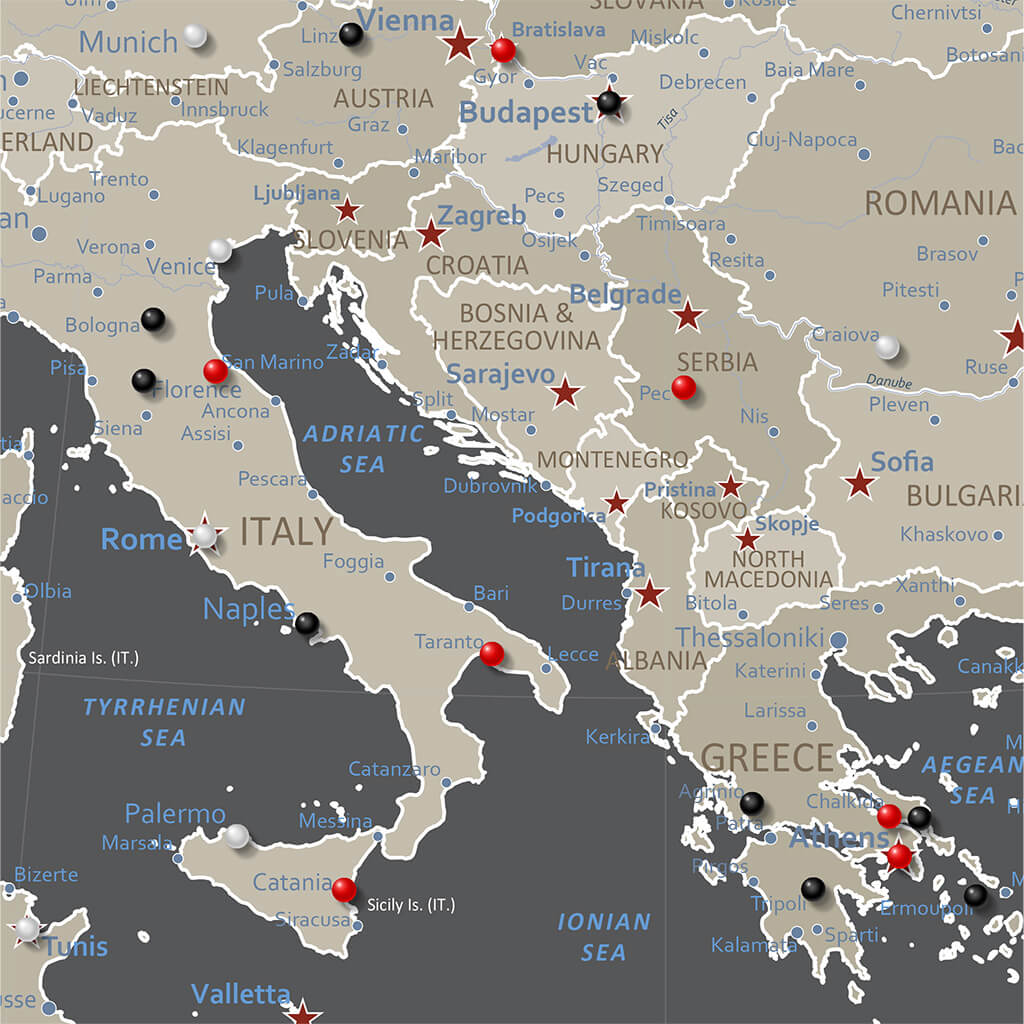 A Gallery Wrapped Canvas Europe Travel Map in our popular Earth Toned color scheme will be your favorite conversation starter in no time! The rich canvas texture and the warm neutral color palette on your canvas Europe map means it'll be a standout amongst the décor in your home or office. With our European travel push pin map, you will be able to keep track of your travels across the region. All country borders and capital cities are featured, as well as most major cities throughout Europe. The eye-catching square design is quite pleasing, created by removing most of eastern Russia from the map. Relive your favorite vacation memories with each new pin you add to your map, and ignite your travel bug with future travel plans! This canvas Europe regional map makes a fun gift for every occasion! From weddings and anniversaries to retirements and more, when you gift a Push Pin Travel Maps' map your friends and family will cherish it for a lifetime!