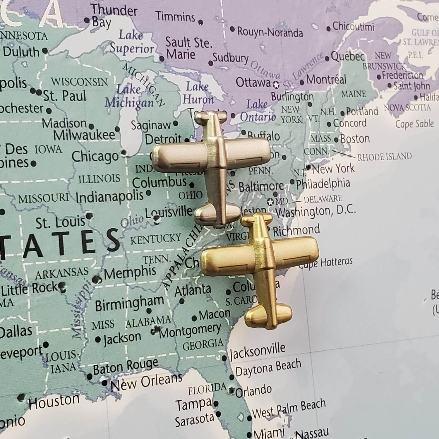 Elevate your travel map with our exquisite propeller airplane push pins, available in stunning gold and silver finishes. Designed by and sold exclusively by Push Pin Travel Maps, these durable metal airplane map pins are perfect for aviation enthusiasts and travelers alike. Add flair to your bulletin board or mark your journey’s flight paths with these unique airplane bulletin pins. Each aviation-themed pin features a rubber backing, allowing it to double as a stylish lapel pin for jackets, hats, backpacks, and more.
