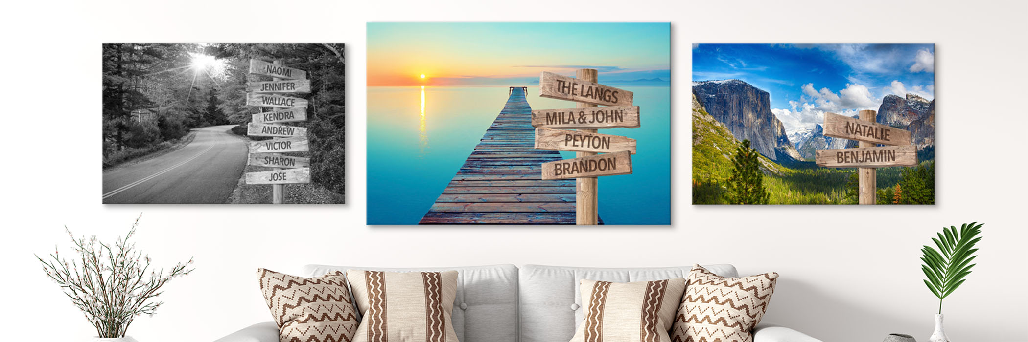 Show off your family love with our personalized family name art. This design features a stunning ocean wave scene at sunset with your family names front and center on the wooden signpost. Include up to 10 signs that can have whatever you like on them! You could highlight where your family lives across the country, your favorite places in the world that hold a special meaning to you, the names of your immediate family members or even add your anniversary date at the top to show when your family was established. Your design will be printed on premium canvas. Choose from a colorful vibrant print or an understated black and white design. Either way, your custom family print will become your favorite décor piece in no time at all! Makes an unexpected and memorable gift for any occasion!