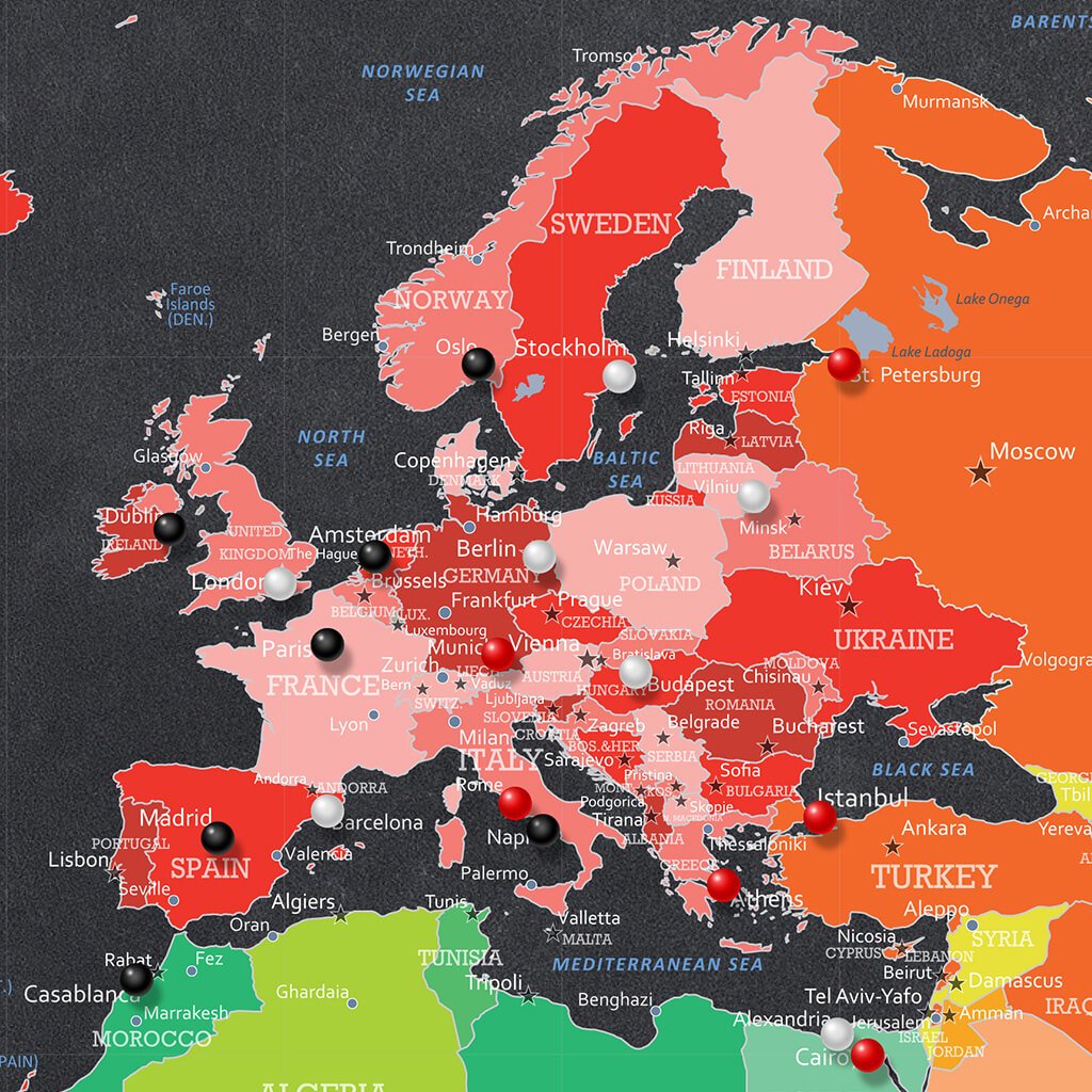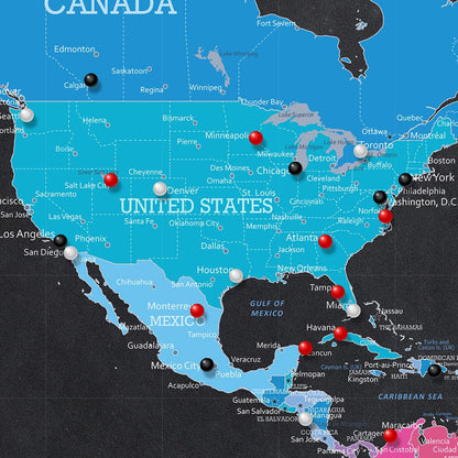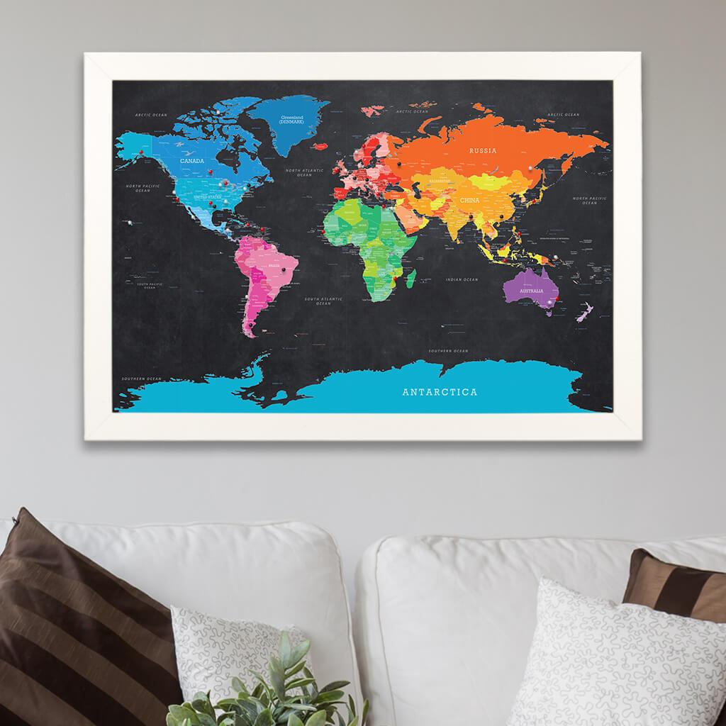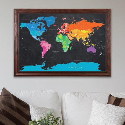 Pin your world travels with this fun and framed brilliantly colored Push Pin Travel Map. Our Bright Night world travel map with pins is our own exclusive design and is a fun and lively way for you to track past travels and plan out future trips. Relive your most exciting travel memories with each new pin you place on your map. The map's bright and bold colors make it an eye-catching centerpiece for any room in your home or even an engaging learning tool in the classroom. Surprise a friend or loved one who enjoys traveling with this unique and one-of-a-kind world map.